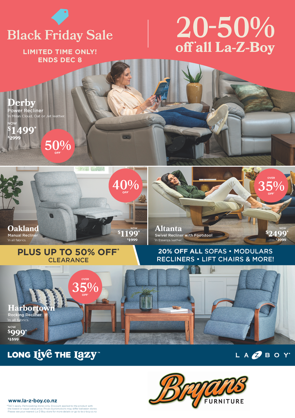 The wait is over – the big La-Z-Boy Black Friday Sale is on now! For a limited time only, save 20% to 50% across our entire La-Z-Boy range. The world’s most trusted recliner brand, bringing you the world’s best comfort at unbeatable value. Save big on favourites like the Harbor town, Oakland and Derby recliners, plus there’s amazing deals on power sofas and more!