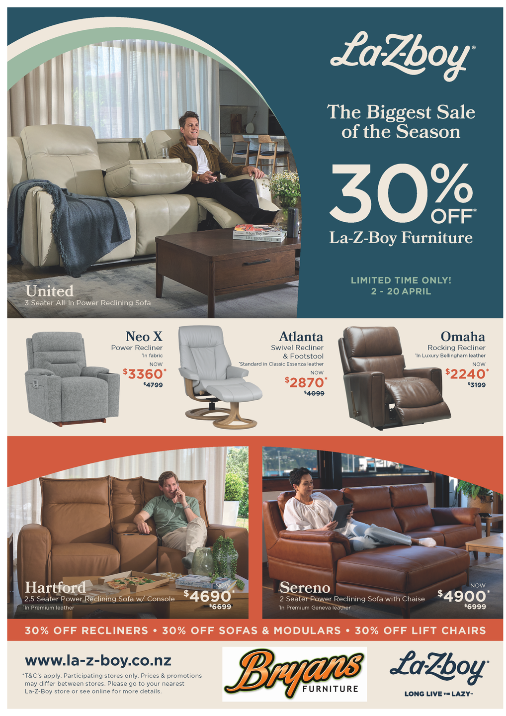 Save a massive 30% off all La-Z-Boy furniture – world famous recliners, sofas, modulars and powered lift chairs. Visit your Bryans Furniture today or explore the full range online. But hurry this Sale is for a limited time only!