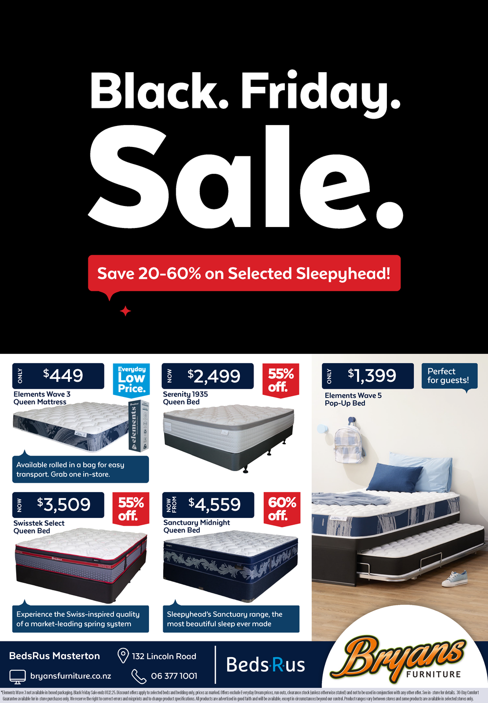 The BedsRus Black Friday Sale is on now! Save 20% to 60% on selected Sleepyhead beds. The Serenity Breeze is half price, queen size now from $1799 OR save 60% on the luxurious Sanctuary Midnight, queen size now from $4559. Check out these deals and more, at bedsRus.co.nz. Find your best sleep today in our Black Friday Sale, on now At BedsRus, where dreams begin.