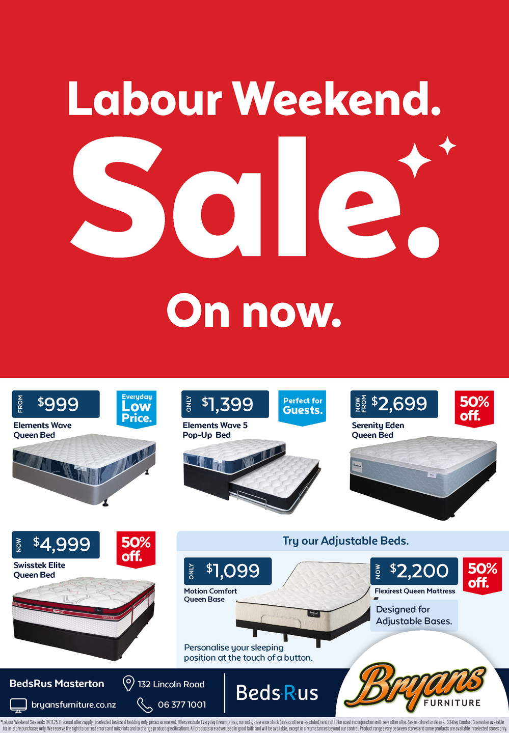 Check out these deals and more, at BedsRus.co.nz. Your best nights’ sleep starts at the Labour Weekend Sale, on now at BedsRus, where dreams begin.