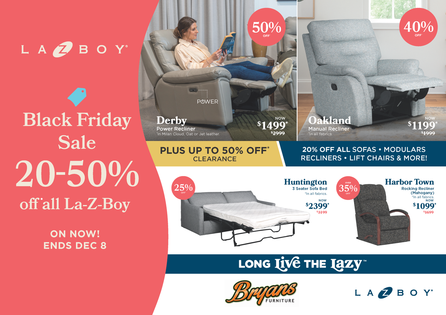 Don’t miss out. Hurry into Bryans Furniture La-Z-Boy store today. Comfort and savings this big won’t last!