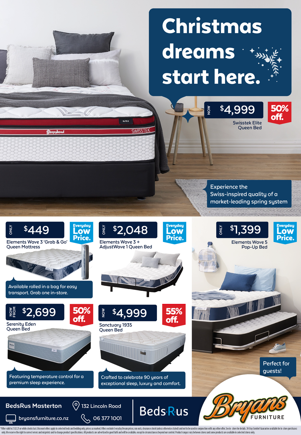 The BedsRus Christmas Sale is on now! Serenity Eden is half price, queen size now from $2699. Or save 50% on Swisstek Elite, queen size now $4999. Having friends or whanau staying over the festive season? Check out our Elements Pop-Up bed, a perfect space saver for only $1399. Check out these deals and more, at bedsrus.co.nz. Great moments start with good sleep. BedsRus, where dreams begin.